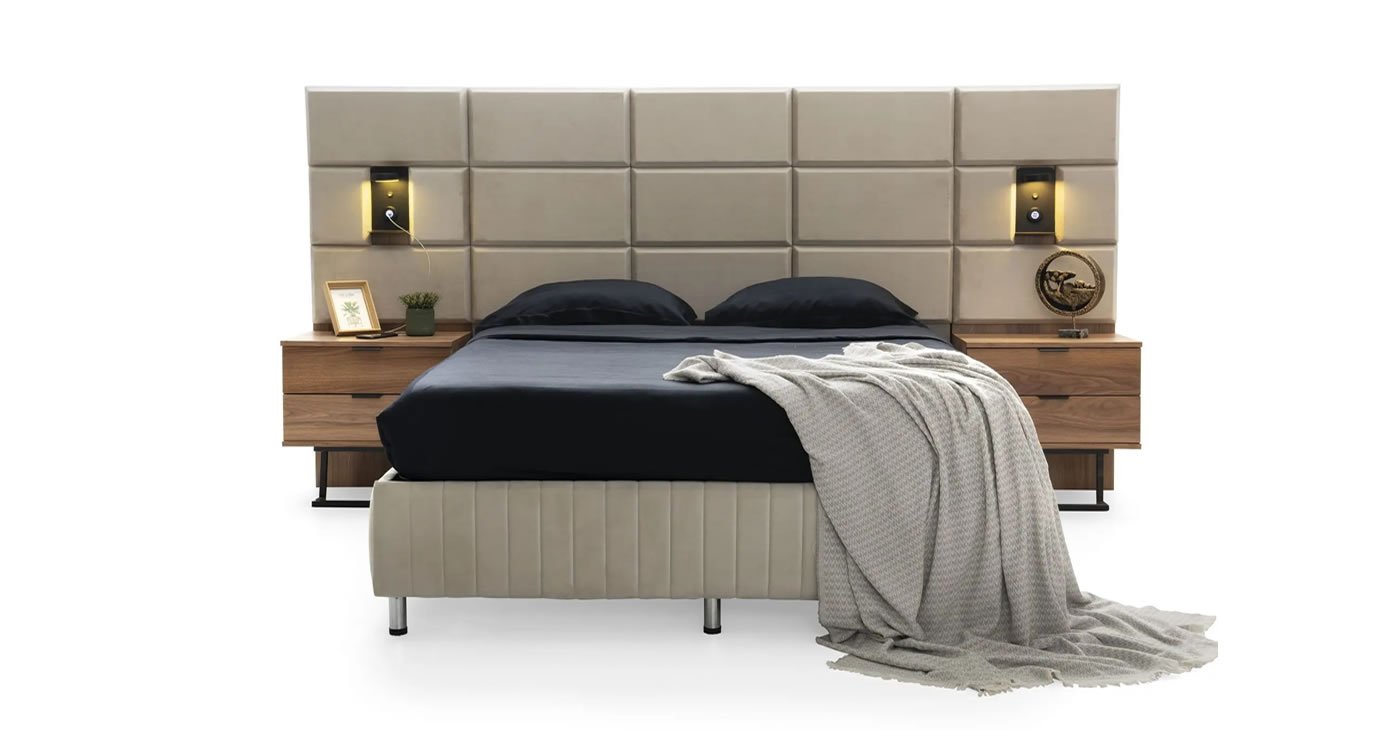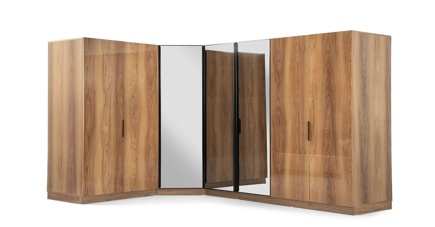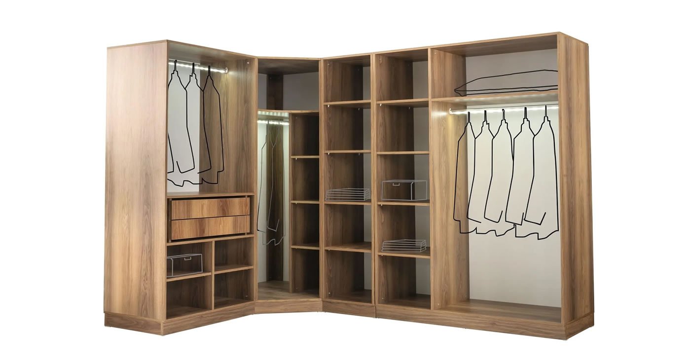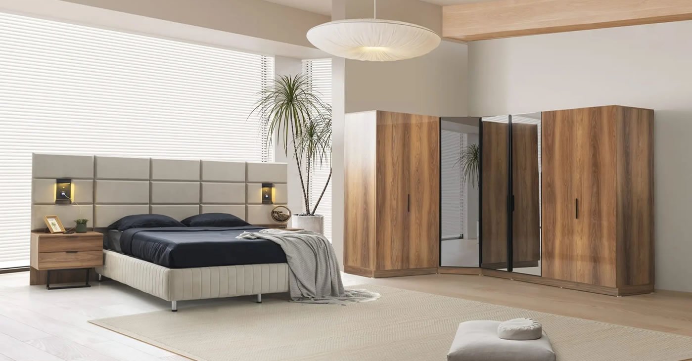 Our bedroom set is a corner L wardrobe and is made of 100 percent MDF. With its independent modular feature, you can choose the size of your cabinet you want. Modules can be added or removed as desired. Cabinet, bedside table and dresser covers are made of lacquer panel. Cabinet doors have hinged brakes. Clothes hangers have LED lights. There is a USB charging port and a sconce light on the panel above the bedside table.