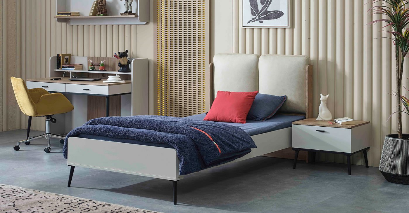 Our Product Content: Nightstand - Study Desk Upper - Study Desk Lower - Bed with Headboard (100*200) - 3-Door Cabinet The price is for a set. Product material is 1st Class Chipboard.