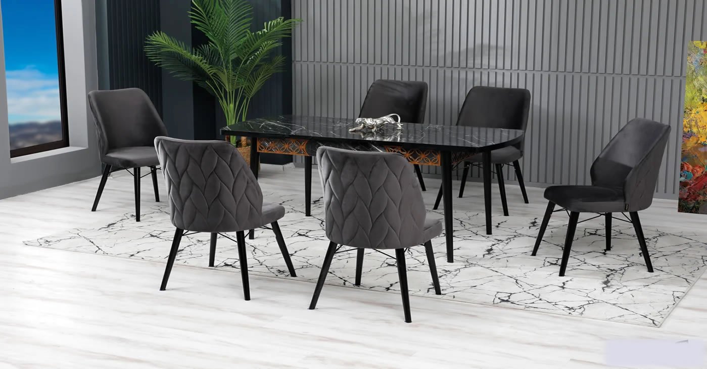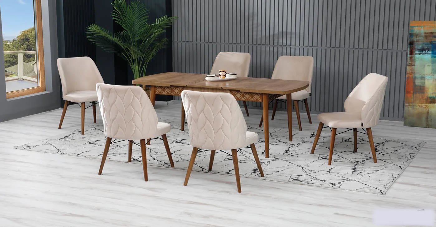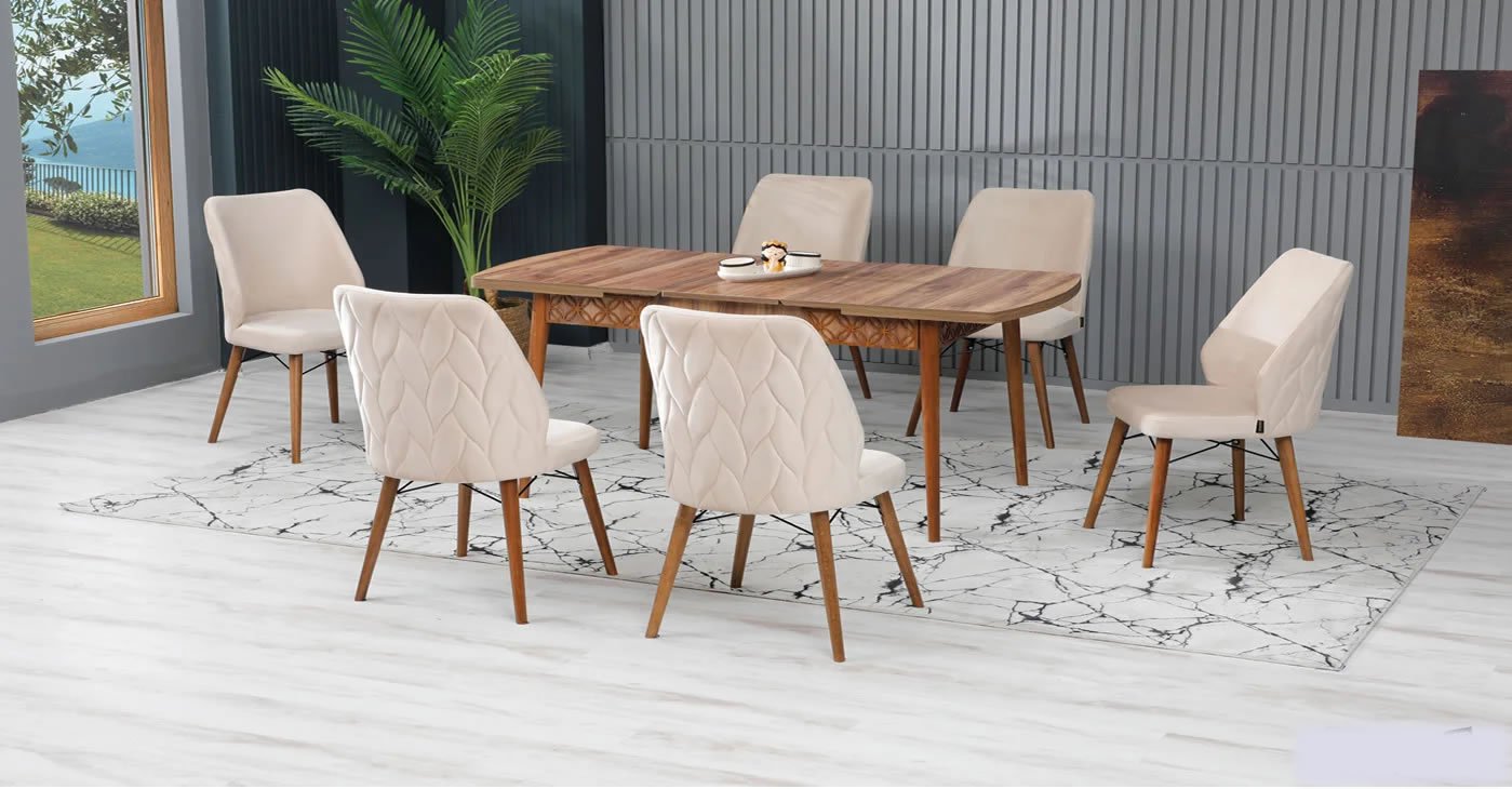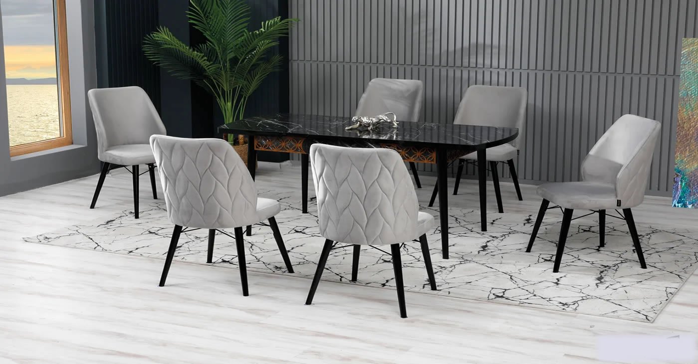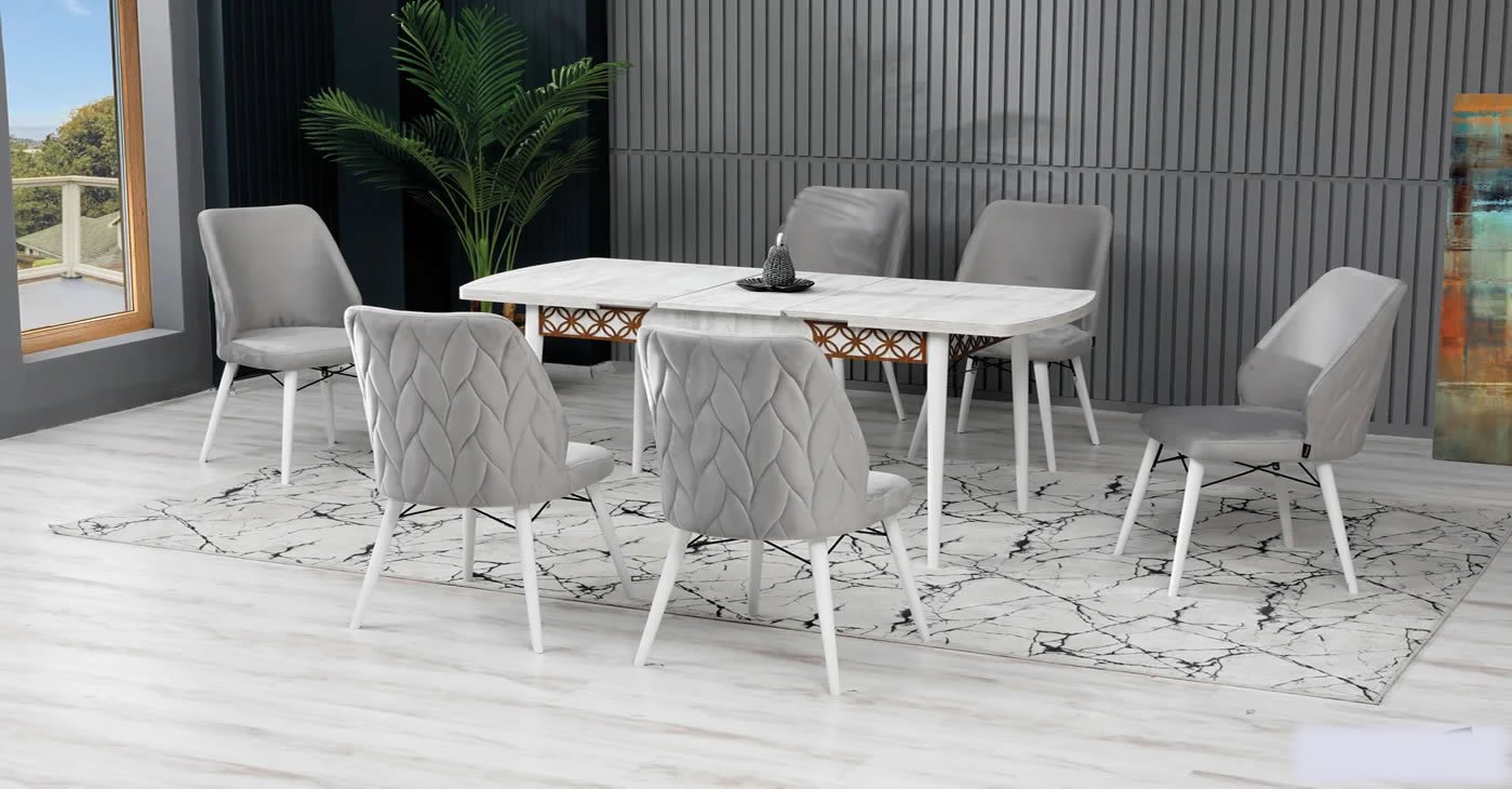 Our product: 6 chairs 1 table:80x130CM & Extendable size: 80x170 CM-- || Wipeable babyface fabric, table and chair are available in all color options. With & Without Laser.