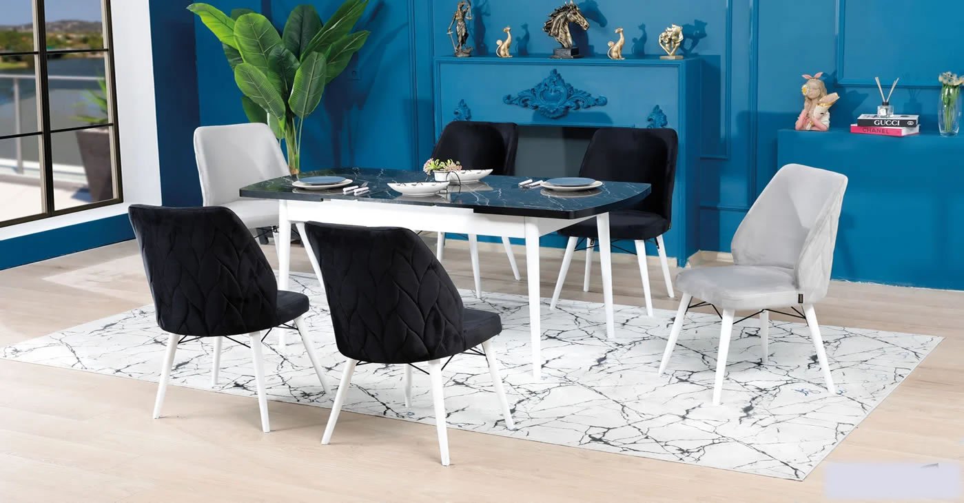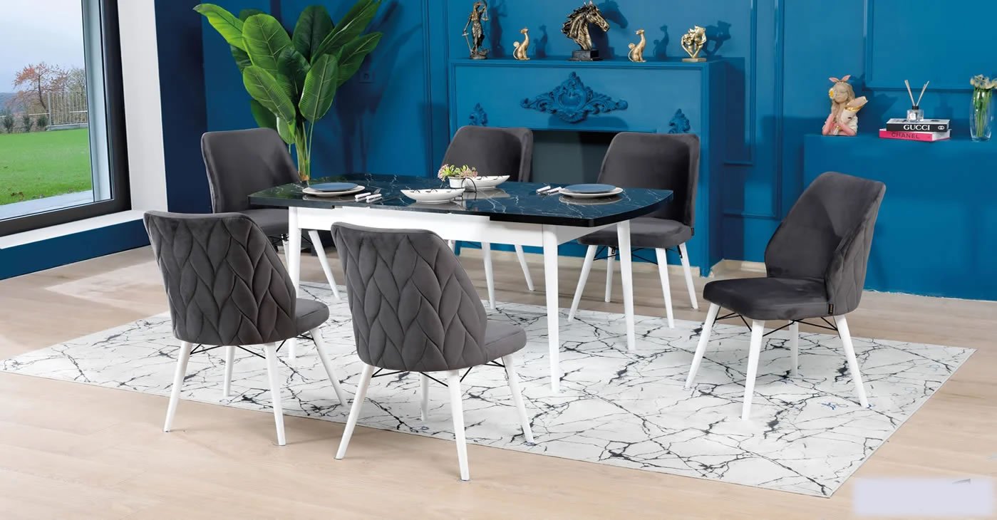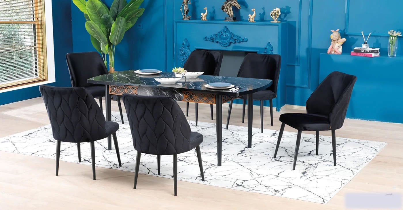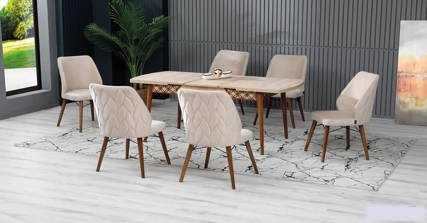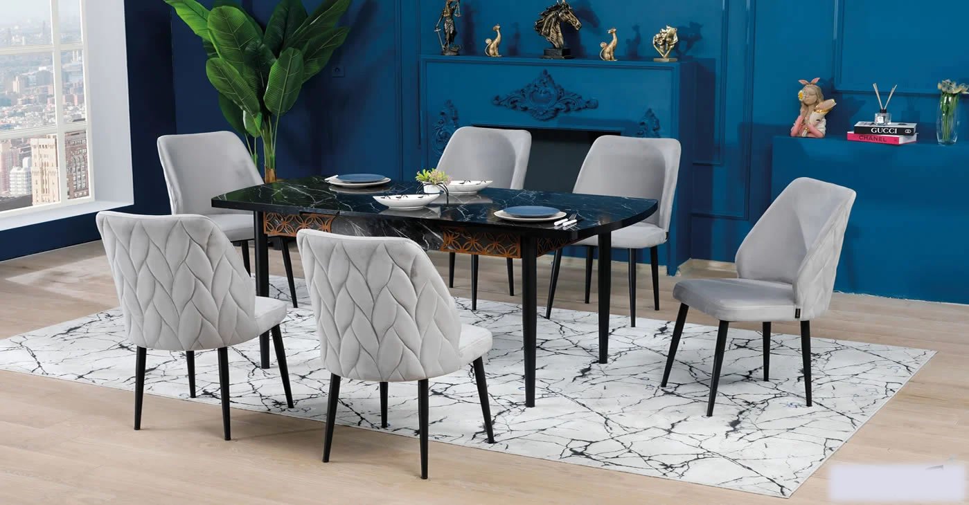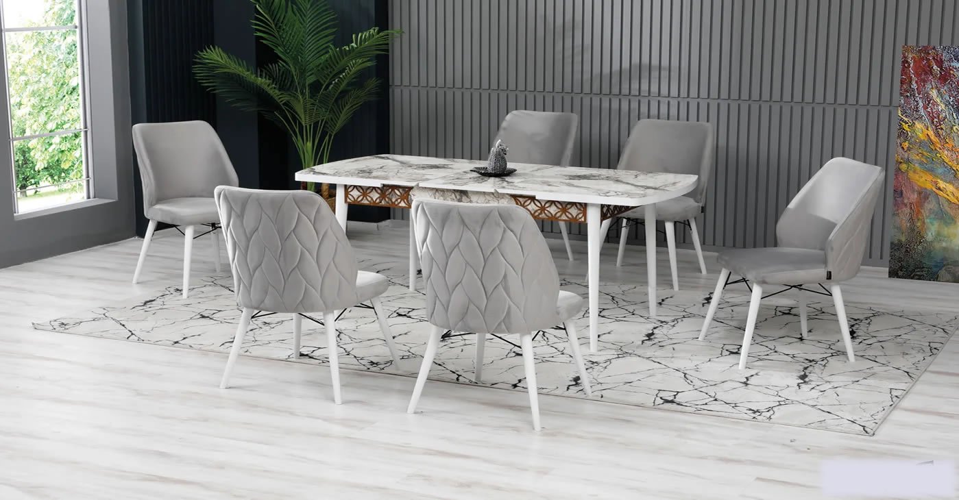 Our product: 6 chairs 1 table:80x130CM & Extendable size: 80x170 CM-- || Wipeable babyface fabric, table and chair are available in all color options. With & Without Laser.