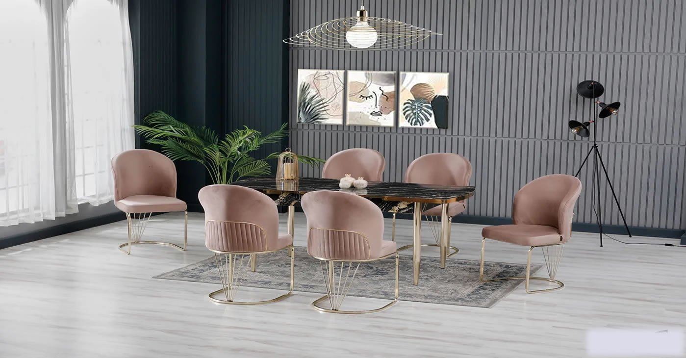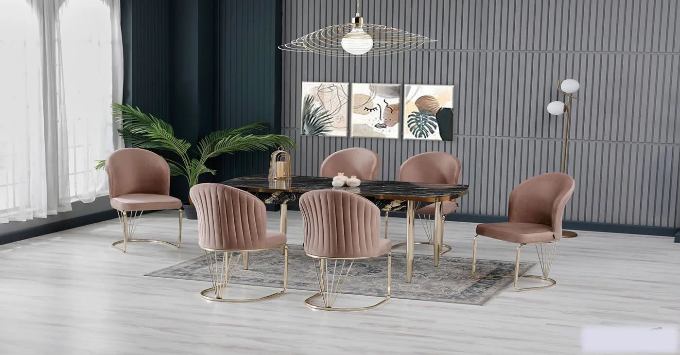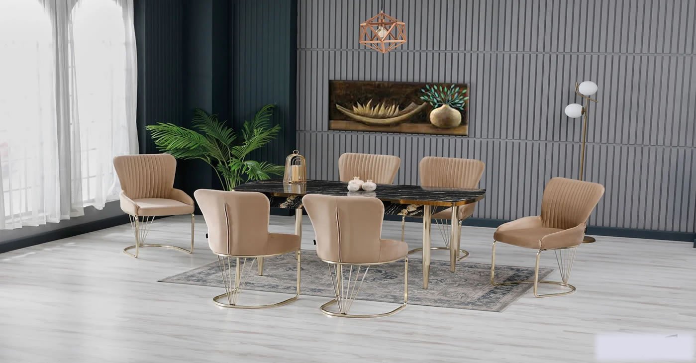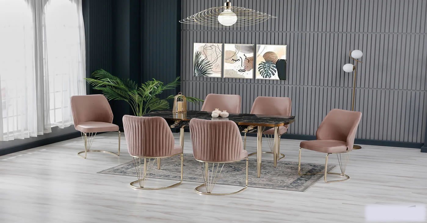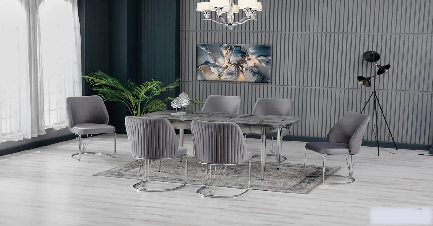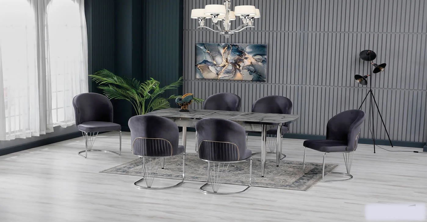 Our product: Chipboard Glossy Table, 6 Chairs. Product Size: Closed 80x130 CM - Open 170x80 CM | Product material details are in the images. Wipeable babyface fabric, table and chair are available in all color options.