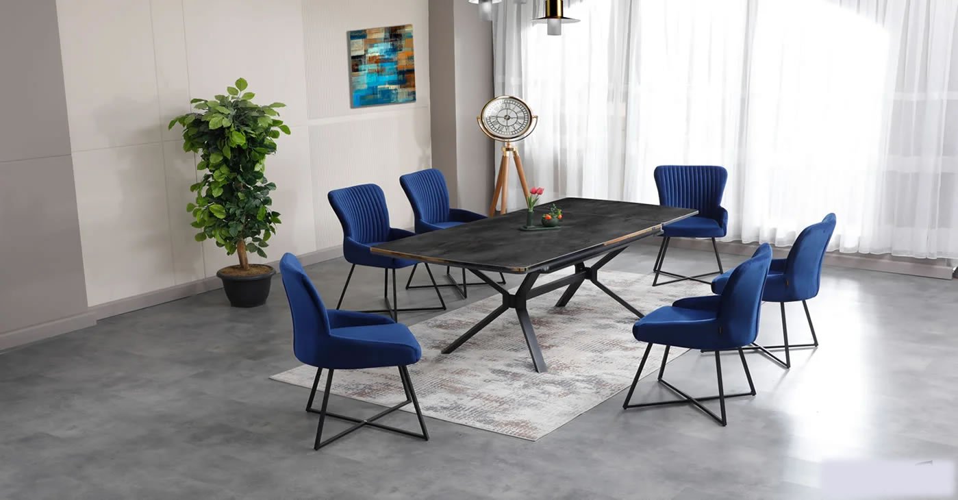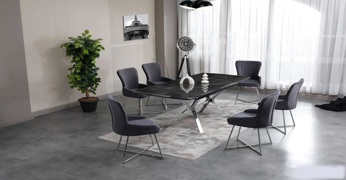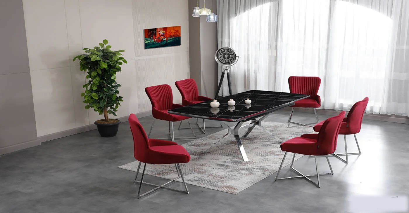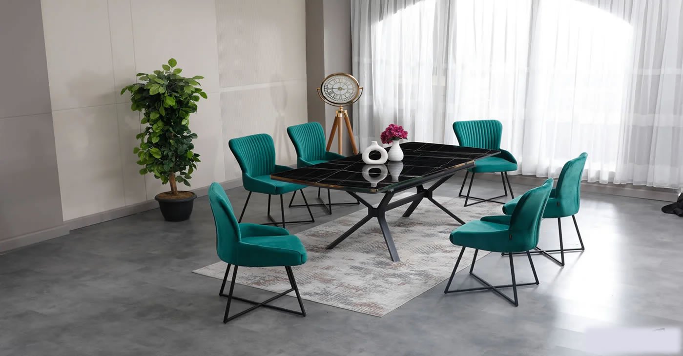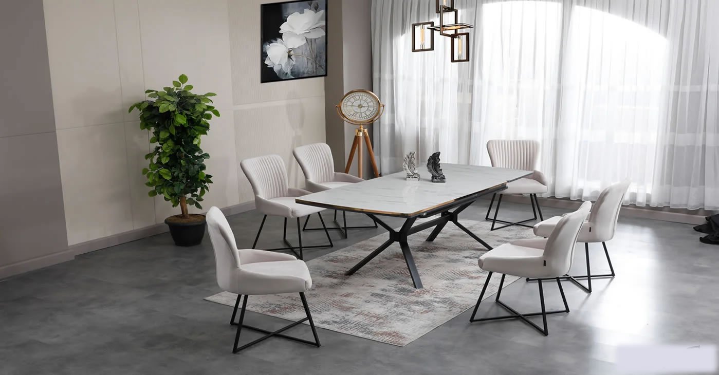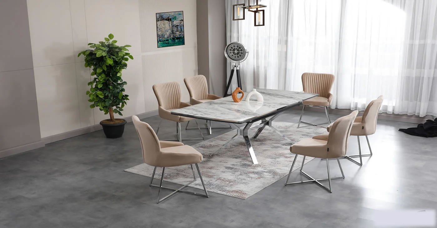 Our product includes: 1 table and 6 chairs. Product dimensions: Indoor 80x130 CM - Outdoor 175x80 CM | Product material details are in the images. Wipeable babyface fabric, table and chair are available in all color options.