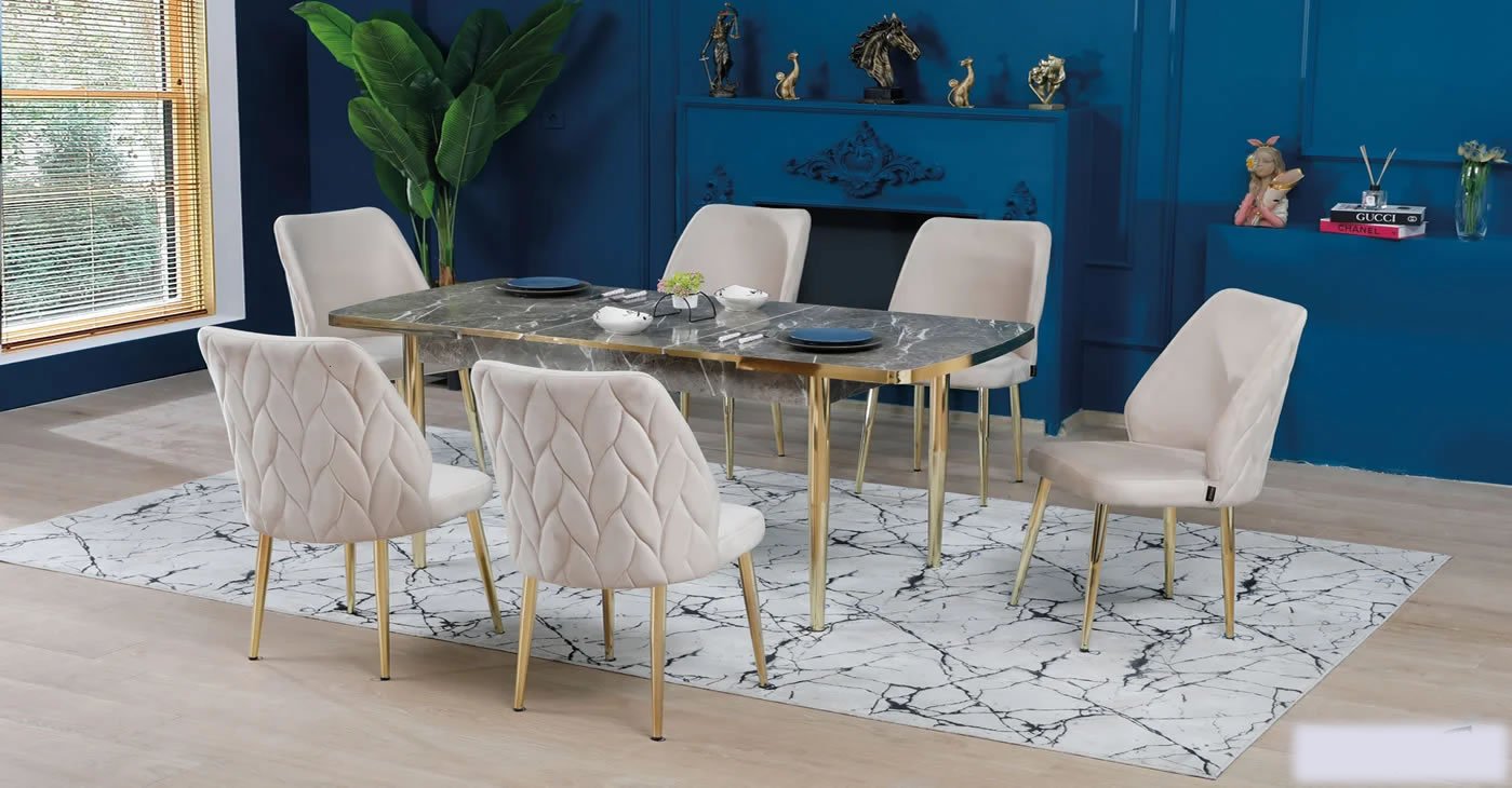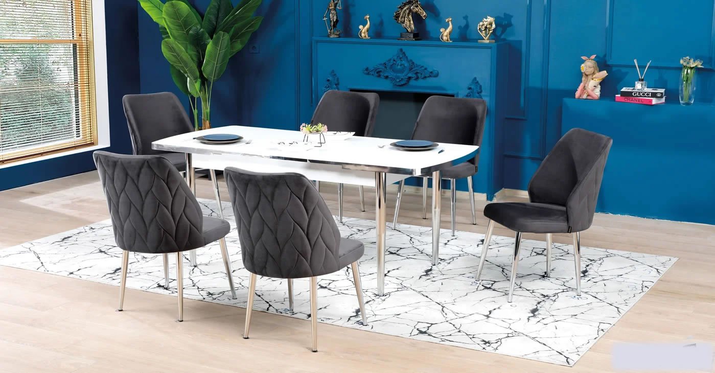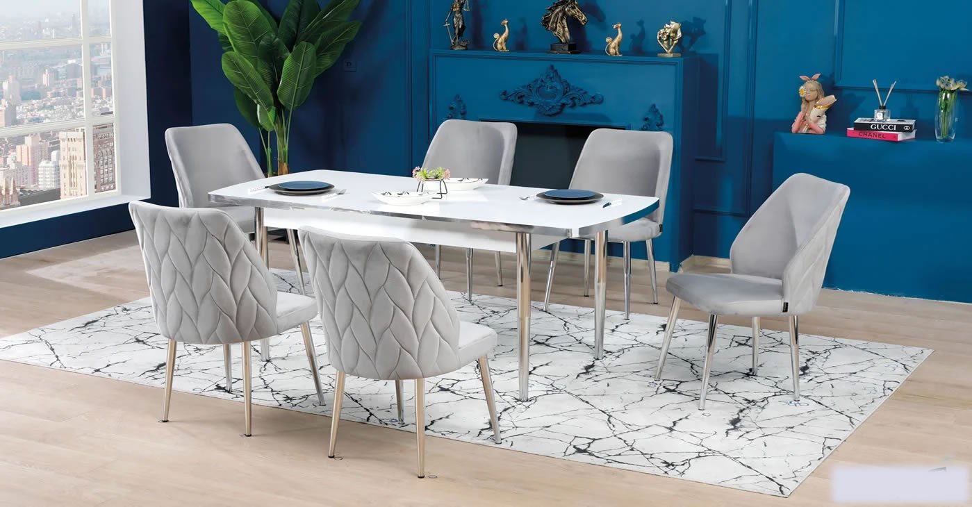 Our product: 6 chairs 1 table:80x130CM & Extendable size: 80x170 CM-- || Wipeable babyface fabric, table and chair are available in all color options. With & Without Laser.