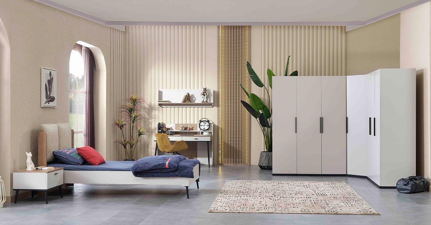 Our Product Content: Nightstand - Study Desk Upper - Study Desk Lower - Bed with Headboard (100 * 200) - 3 Glass Doors - Corner Cabinet Cabinet - 3 Door Cabinet Cabinet is available. Price is for a set. Product material is 1st Class Chipboard. Price is with Glass.