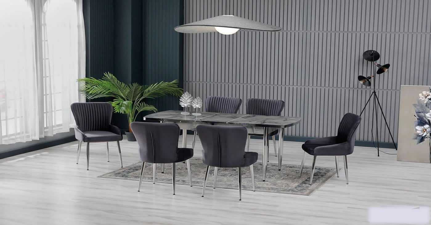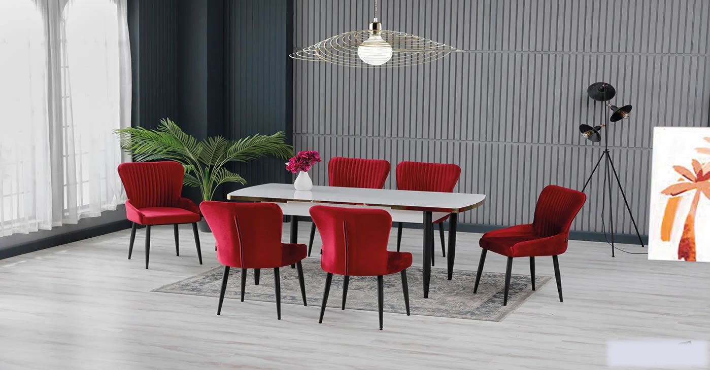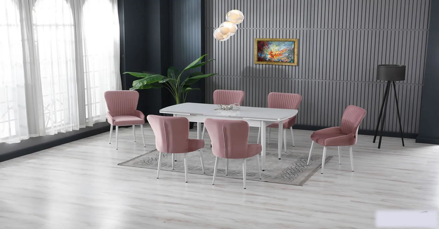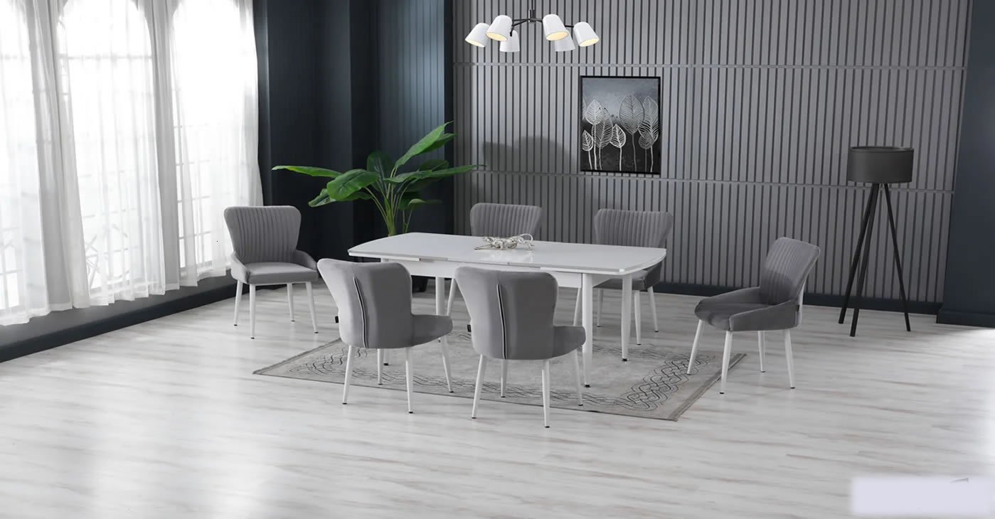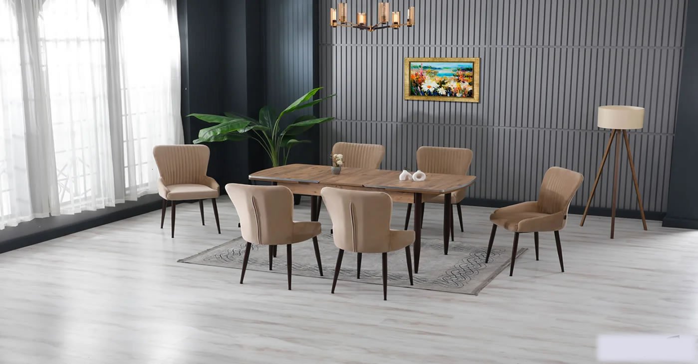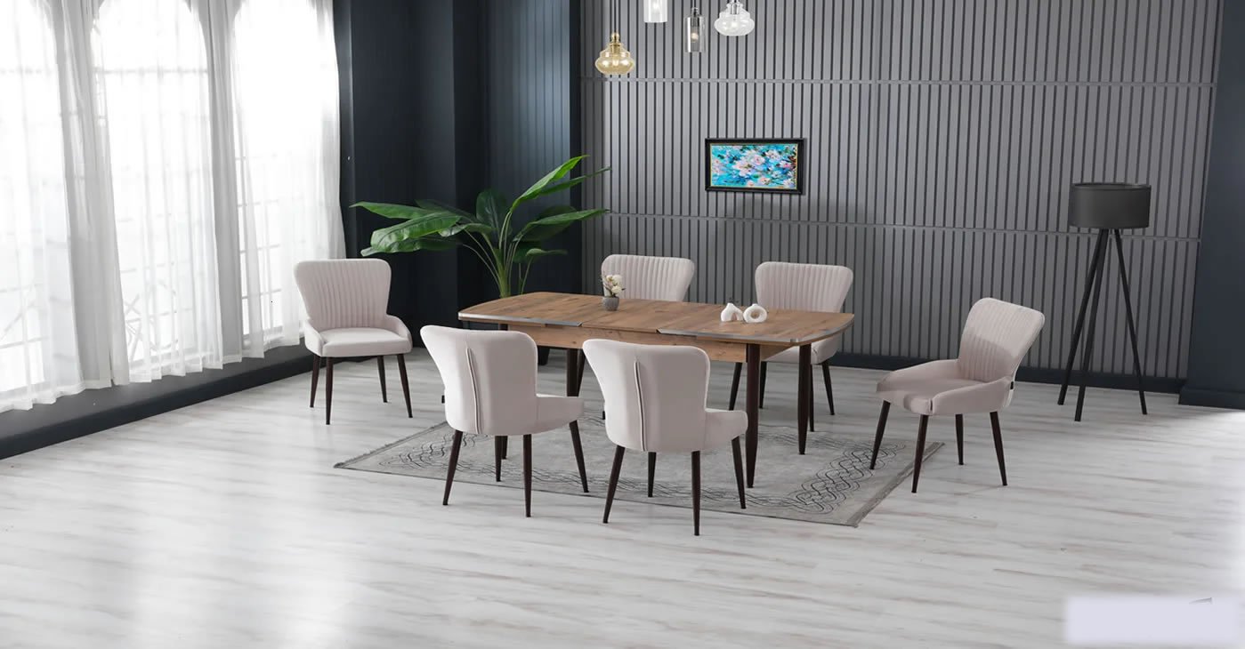 Our product: 1 MDF Table, 6 Chairs. Product Size: Indoor 80x130 CM - Outdoor 170x80 CM | Product material details are in the images. Wipeable babyface fabric, table and chair are available in all color options.