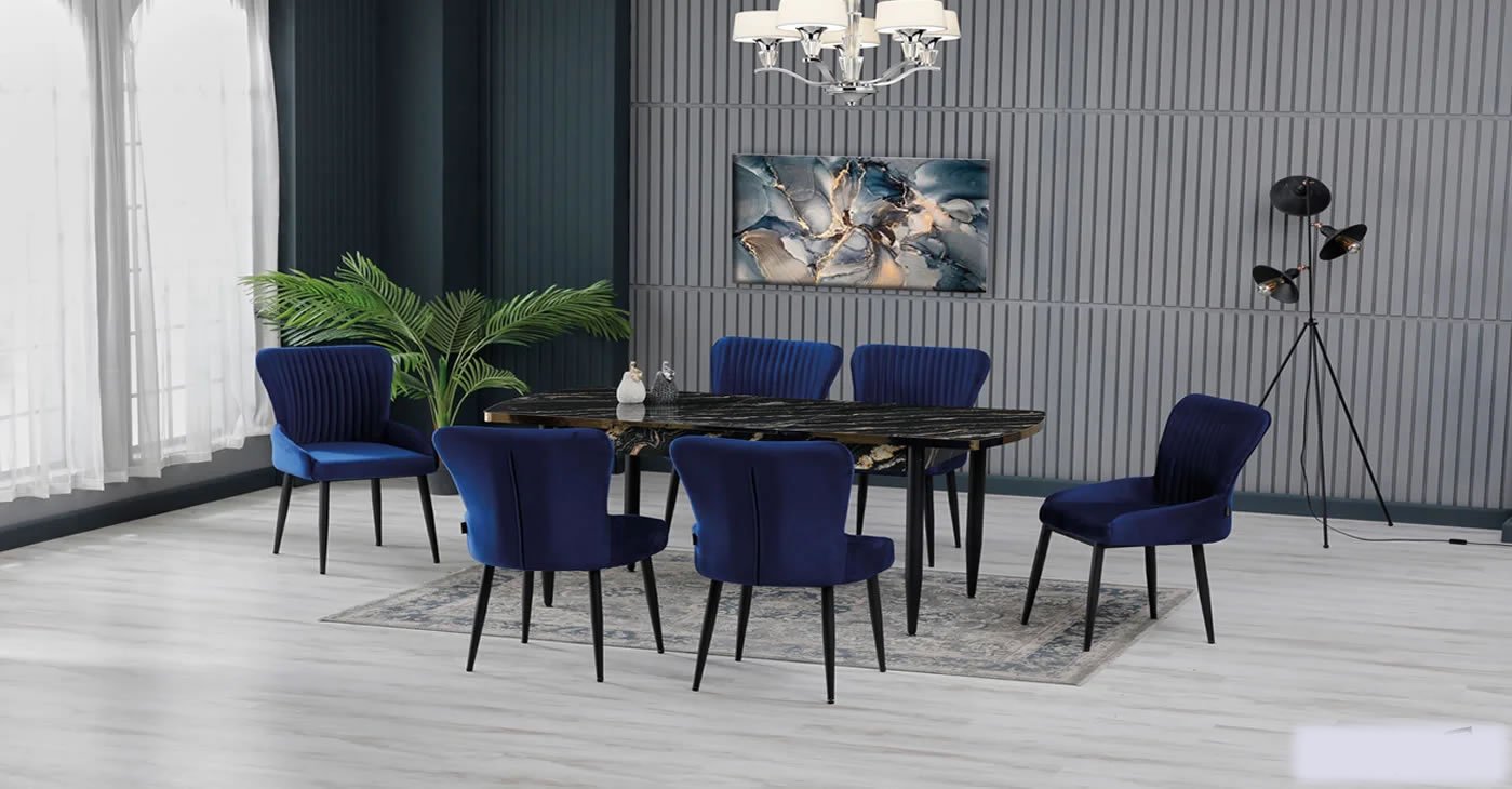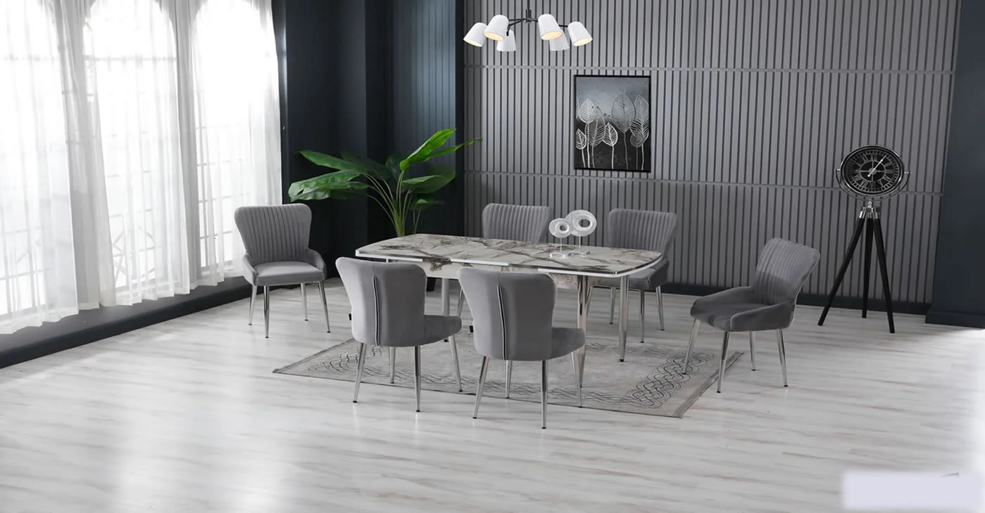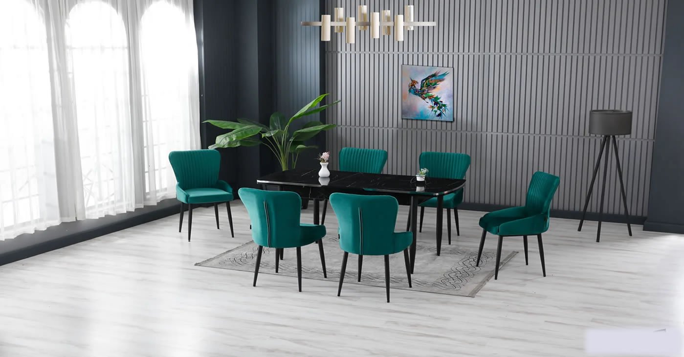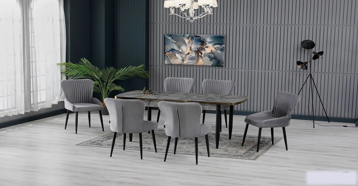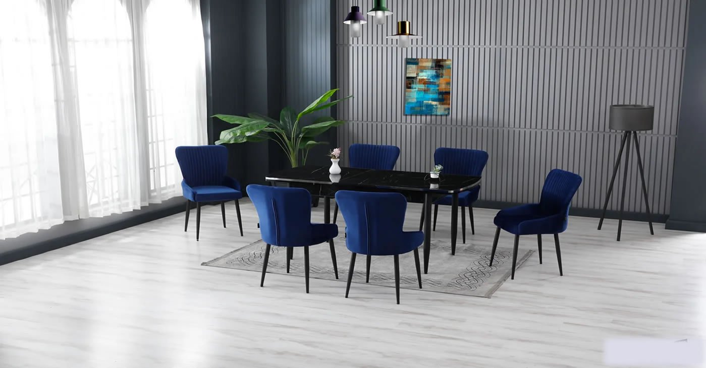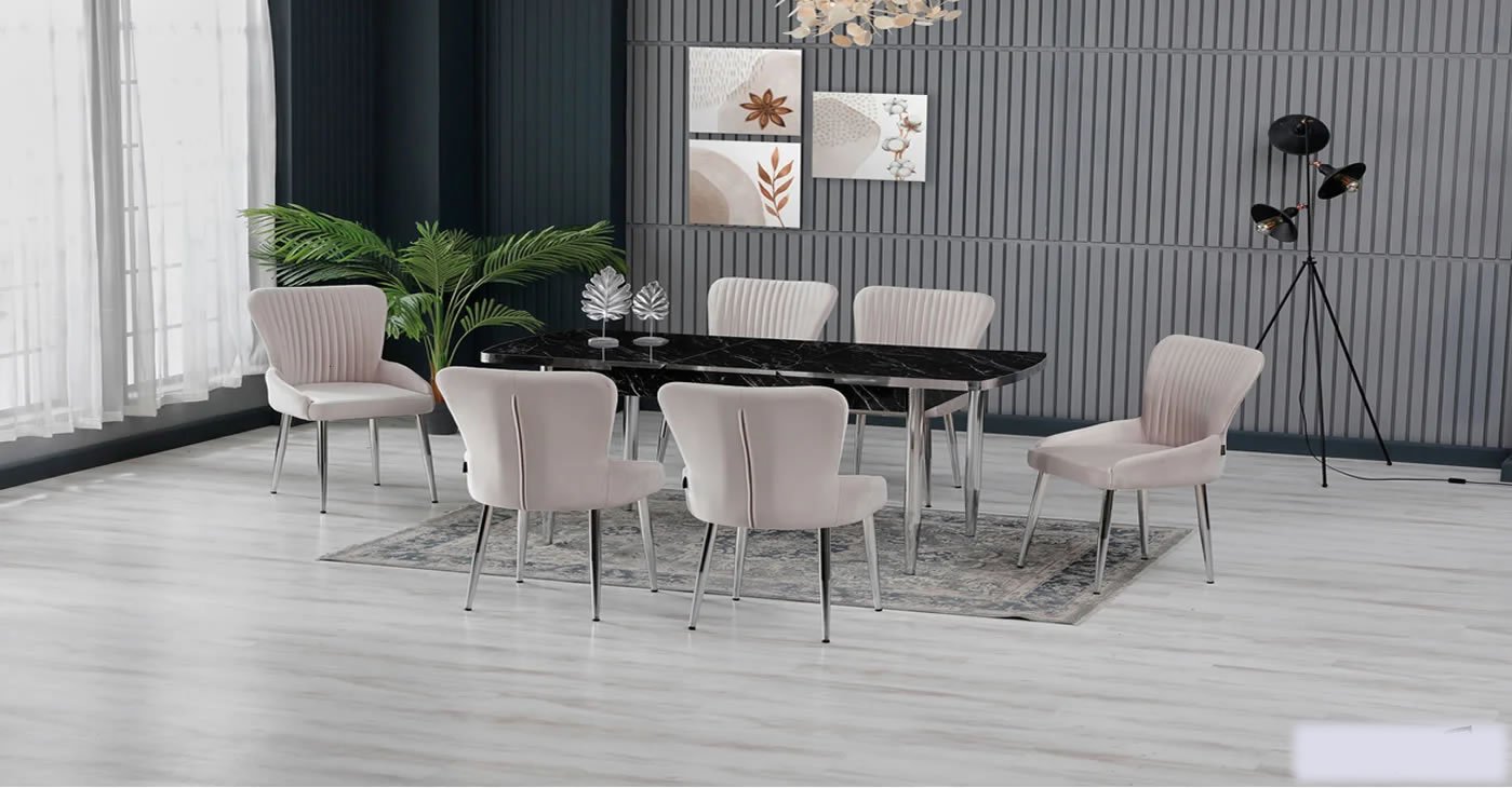 Our product: 1 MDF Table, 6 Chairs. Product Size: Indoor 80x130 CM - Outdoor 170x80 CM | Product material details are in the images. Wipeable babyface fabric, table and chair are available in all color options.